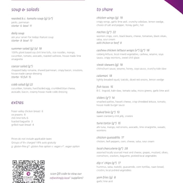 Vintner's Grill, located within the Coast Capri Hotel, offers a relaxed dining experience with a menu that blends Canadian and international flavours. The restaurant features an enclosed patio with open-air access and hosts live music every Saturday evening.